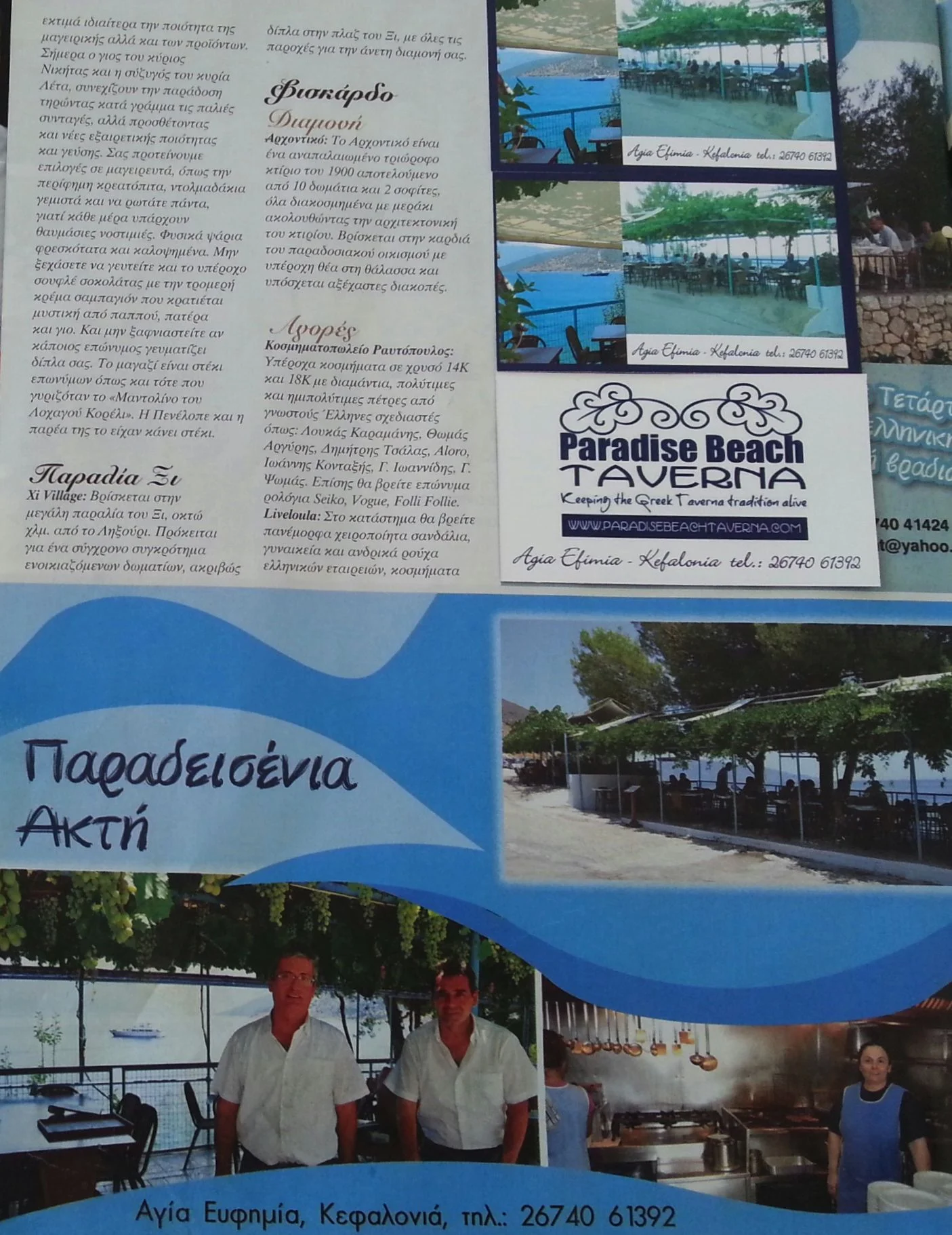 Paradise Beach Taverna has found fame among celebrities from both Greece and abroad, most notably during the filming of Captain Corelli’s Mandolin, across the bay in the town of Sami, when the whole crew, including Penelope Cruz, Nicolas Cage and John Hurt made the trip round the bay every night to eat at the Paradise Beach Taverna.